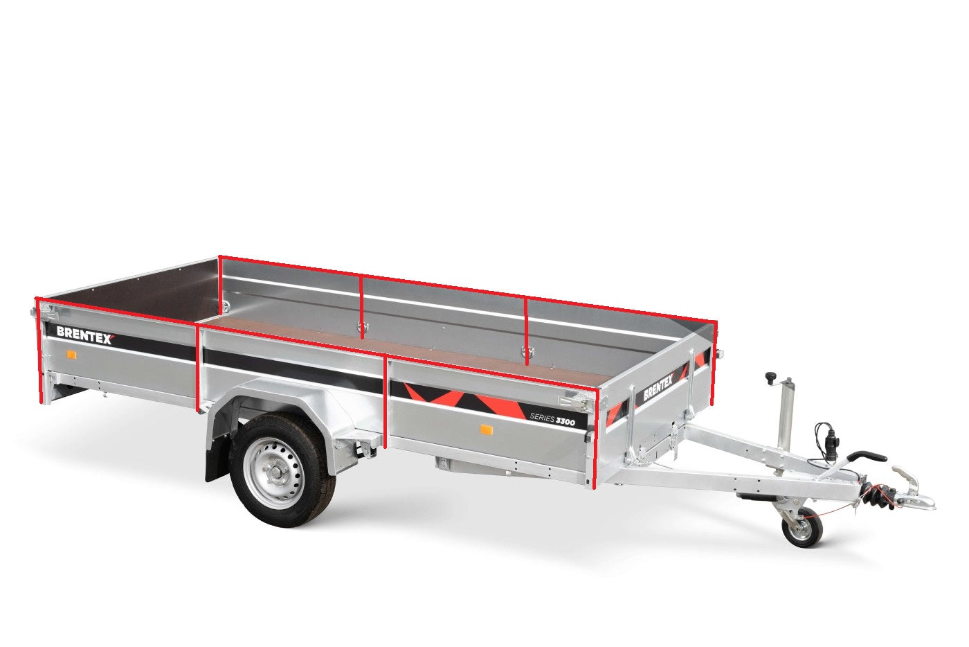 Laidoissa on vahvat tukipilarit, jotka näkyvät kuvassa (2 Kuva) punaisina viivoina. Tukipilarit on yhdistetty runkoon ja uppokuumasinkitty yhdessä rungon kanssa, mikä tekee laidoista erittäin kestävät ja pitkäikäiset. Etu- ja takalaidat ovat poistettavissa, mikä helpottaa pidempien kuormien kuljettamista ja kuorman käsittelyä.