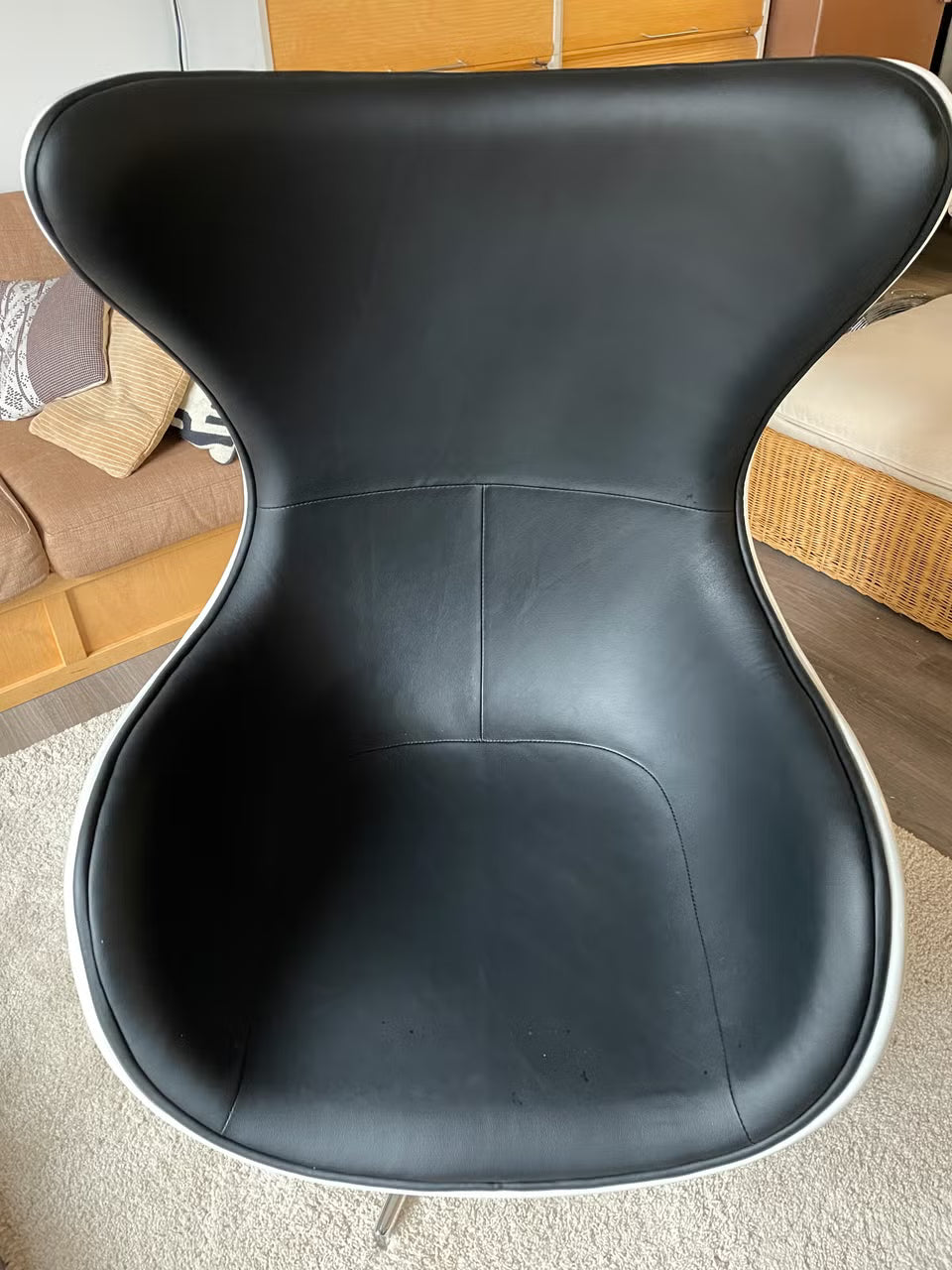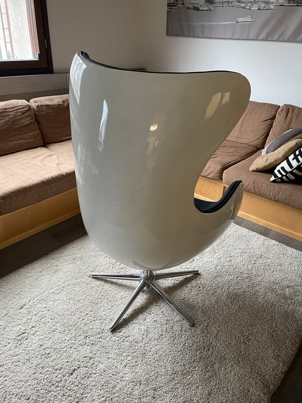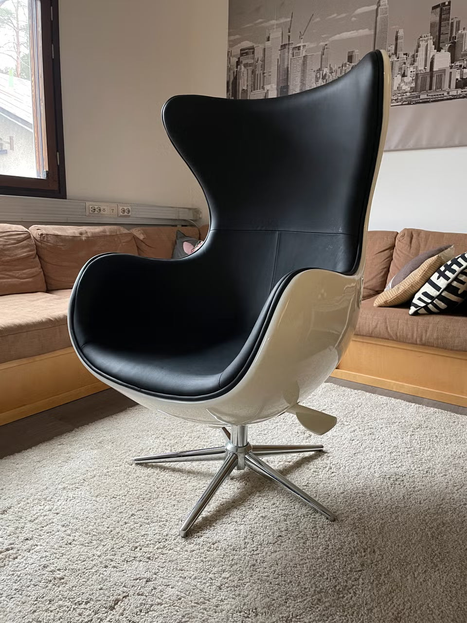 Tyylikäs ja moderni valkoinen design tyylinen-tuoli, jossa kiiltävä ulkopinta ja musta keinonahkaverhoiltu istuinosa jossa yhdistyvät elegantti design ja mukavuus.
