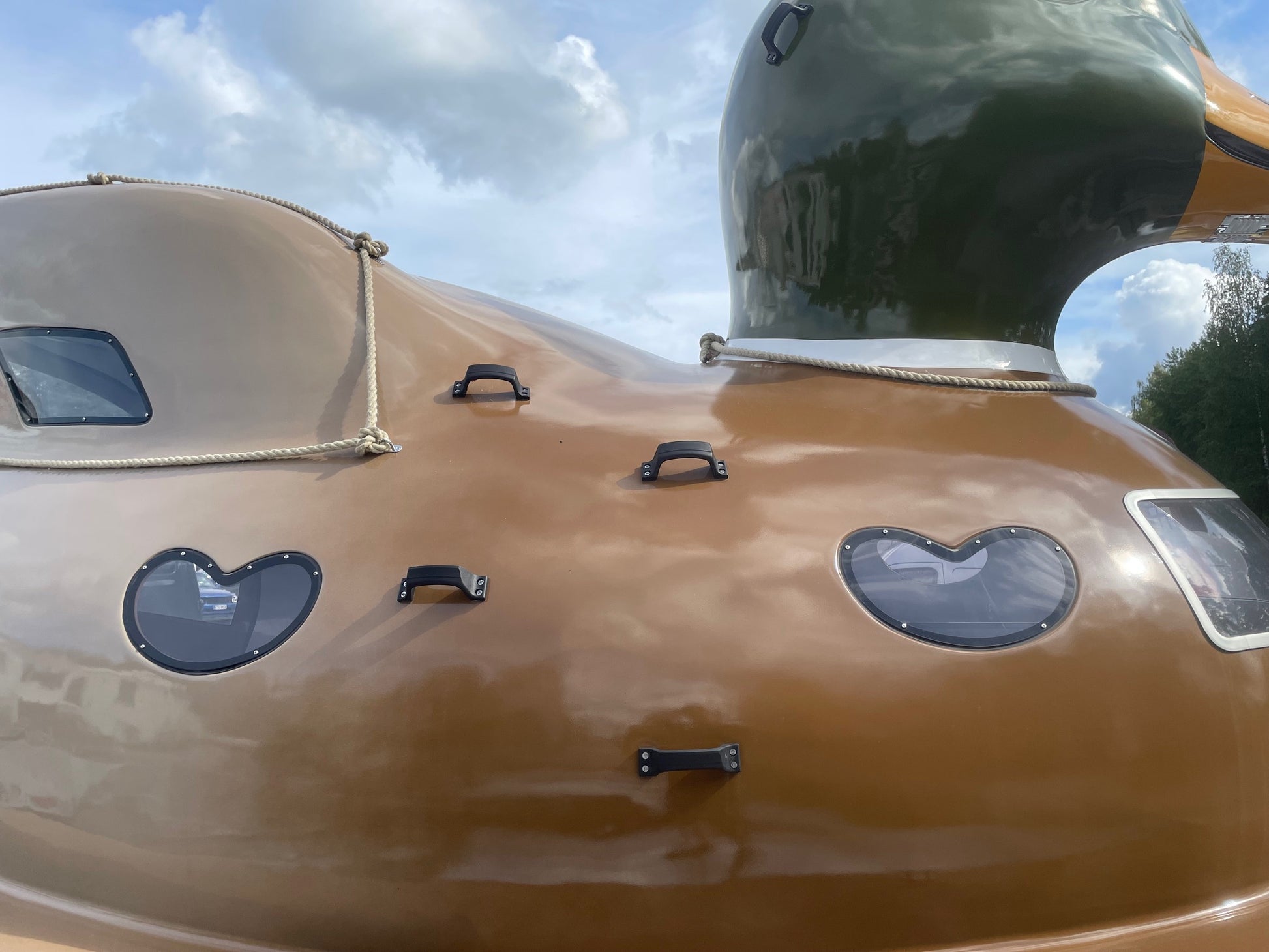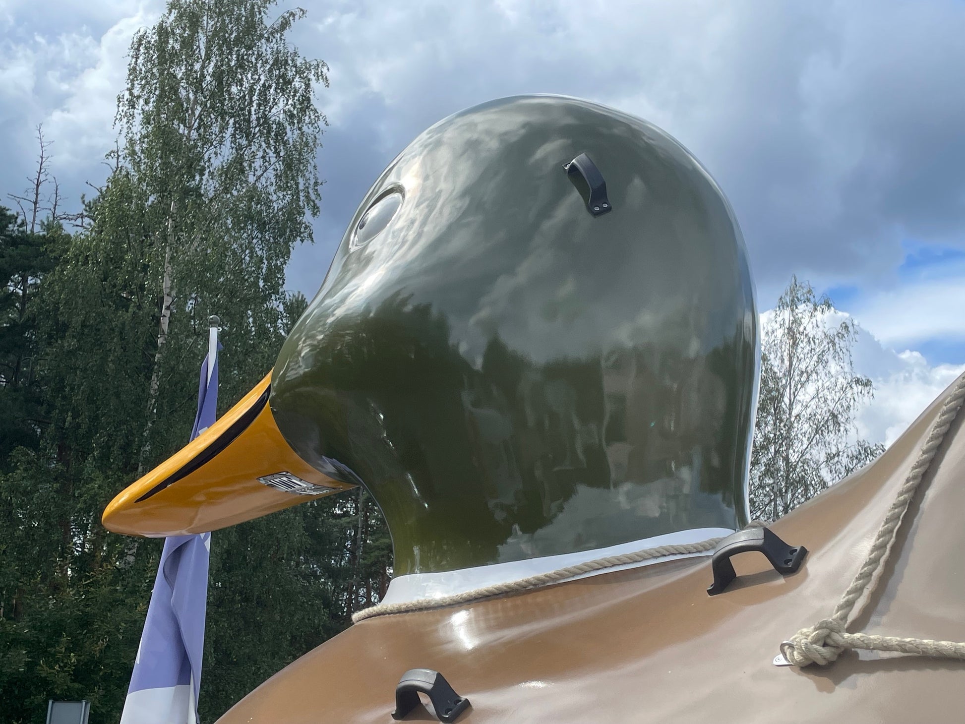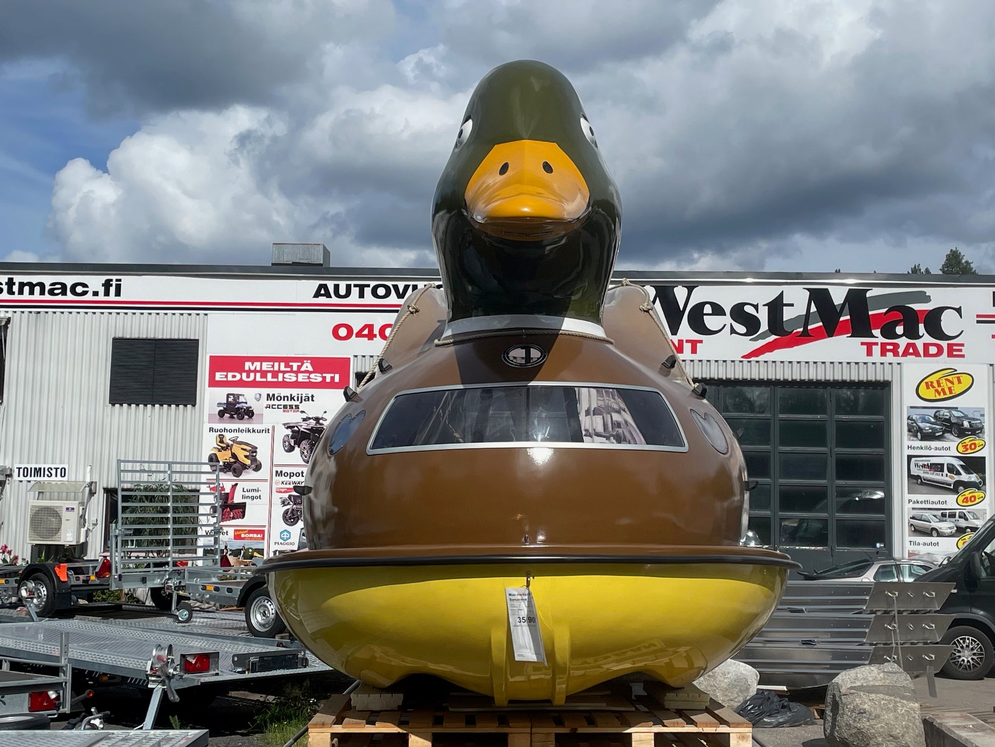 Tämä ainutlaatuinen vene on muotoiltu sorsan näköiseksi, mikä tekee siitä erottuvan ja mielenkiintoisen katseenvangitsijan vesillä.